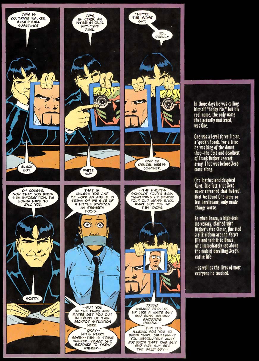 Dissertation In issue #11, a strangely jaundiced Øne manages to do something the company never quite managed to do: explain the basic premise of the series. Note the very dark Sabrina (whose badge and other police uniform accessories are missing), so dark we have no idea who this woman is. By ChrisCross and Tom Simmons XERO Copyright © 2003 Christopher J. Priest. All Rights Reserved. |